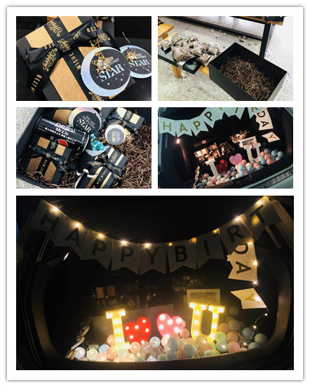 老公很容易感动,在他生日还有三个月时,想着给他准备一个有意思的礼物,就自己买了很多小礼物,等到生日的前几天,我就给每件礼物打包,布置在后车厢,花了很多时间和心思,却也很温馨浪漫。