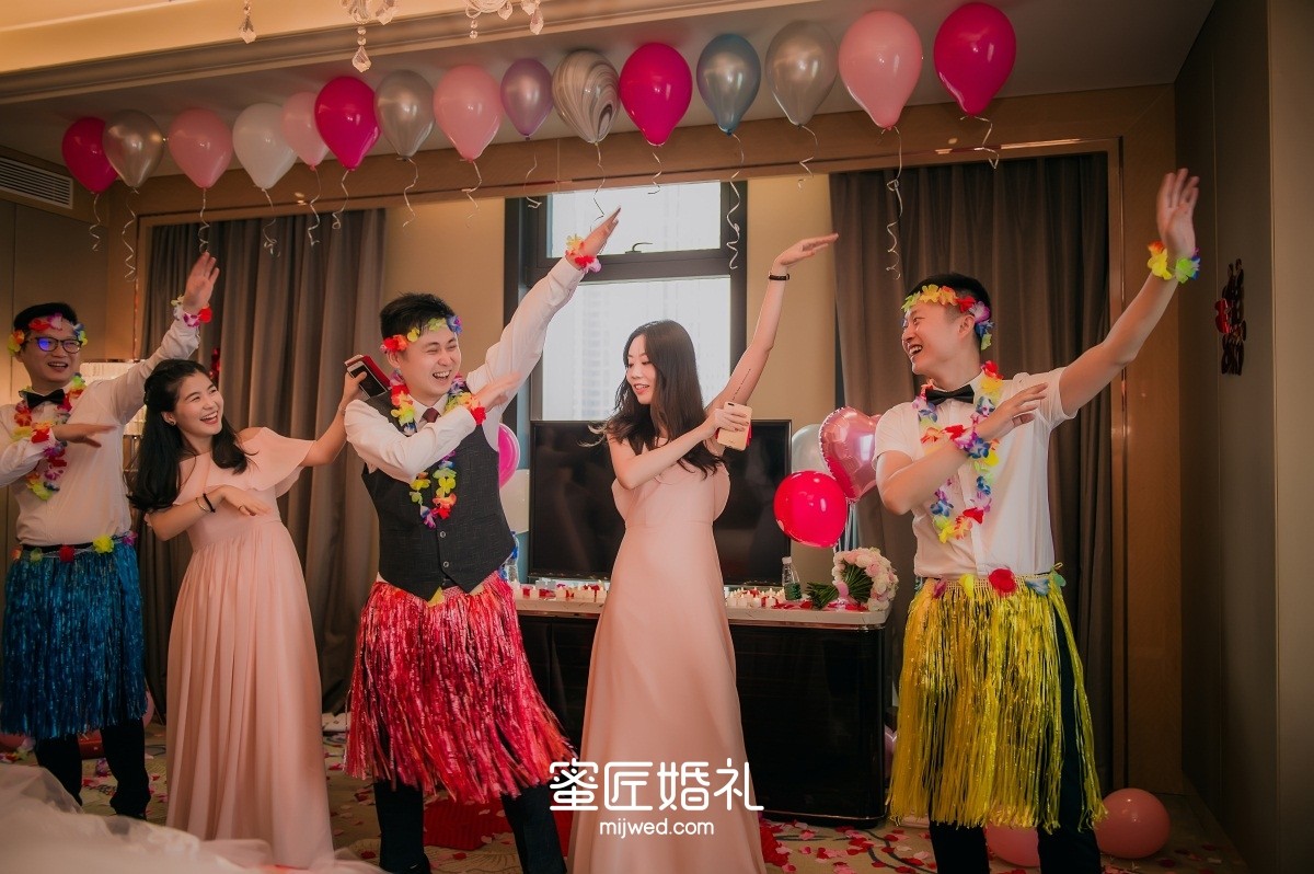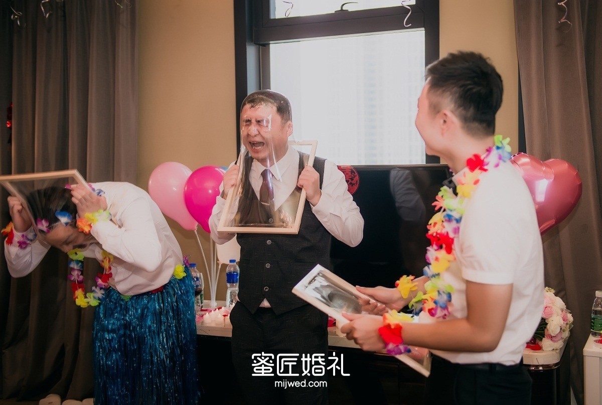 游戏的道具也是网上采购的,老公和伴郎们穿上流苏裙子跳团舞,脱鞋踩指压板气球,虽然有点小心疼老公和伴郎们,但更多的还是感动和爆笑。