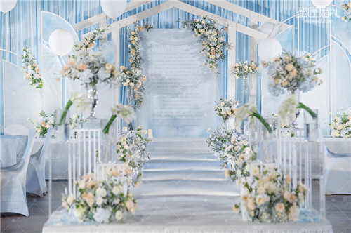 3.红地毯:新人步上红地毯意味着婚礼的开始,席间新人换装也会再次步上红地毯,可以放置落地花柱,地毯上铺洒花瓣,也可以运用气球,甚至可以用道具搭建走道等来吸引众人目光。