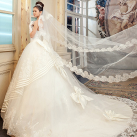 一、50年代流行的好莱坞风婚纱礼服,主打华丽的蕾丝公主拖地裙,尽显新娘的端庄优雅之态。