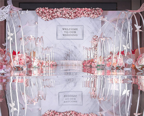 因为婚礼布置中花艺是少不了的,那在进行粉色婚礼现场布置的时候其花艺自然是以粉色系为主,无论是餐桌上的装饰花束、花亭的装饰花束、签到台上的鲜花花束还是新娘花饰。比如粉色玫瑰、粉色百合等就是不错的选择。