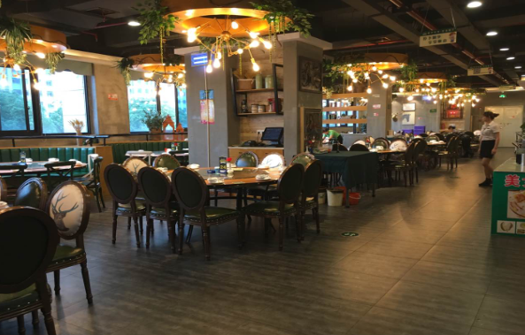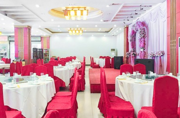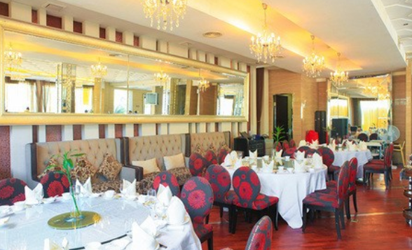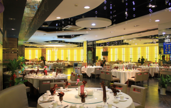 这家餐厅店装修高端奢华,一共四个楼层,其中一楼为大厅(可容纳12桌),无舞台,有音响设备,电视机。二楼和三楼一共6个包厢,可容纳22桌;四楼为豪华包厢可容纳四桌。