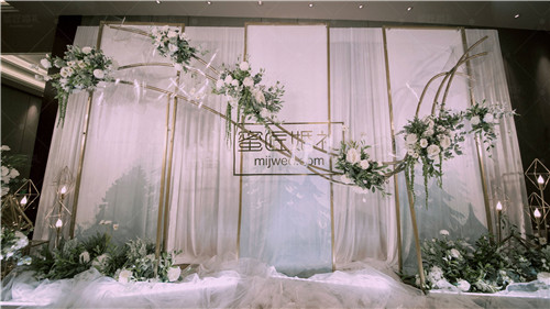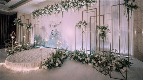 迎宾区用双层优质白色布幔打底,结合金色铁艺框、流线铁艺骨架,打造出网格布半透明的效果。3D山雾造型与不规则亚克力板花艺造型塑造生机勃勃之感,朦胧意境,实体3D,仙雾造型。