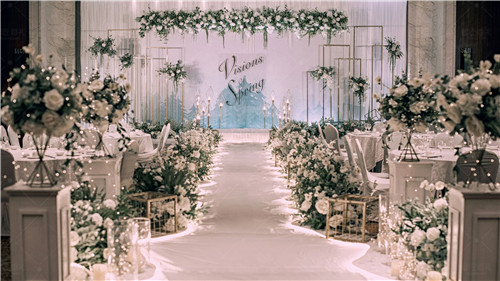 由于婚礼是森系小清新婚礼的风格,那么酒店的装修风格和婚礼风格搭配挺重要的,风格相近,婚礼效果会被放大很多。选择的酒店较好是,浪漫的欧式建筑风格,舒适的景观庭院,布置森系小清新婚礼还是很大气的。选酒店前要大概清楚有多少嘉宾,确定好桌数,根据自己的桌数选择酒店的厅,然后看宴会厅有没有柱子,适不适合布置,效果怎么样。厅的层高也很重要,有点时候都会在布置婚礼的时候加一个顶,这样更大气。如果需要吊顶就选择层高4.5m以上的宴会厅,如果不需要就3m到4m效果较佳,太高会显得空荡,矮了又沉闷,一般来说,婚礼都是有较佳层高的。如果担心桌数少,有时候嘉宾会带小孩子,可以多准备一两桌备用,和酒店提前商量好,没动可以退掉,和婚宴酒水的准备一样,多准备点会体面到位些。