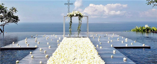 舞台设计,水上大道两旁摆放冷烟火,新人进场时使用。待新人到达中央舞台时,感应LED灯逐数亮起,围绕整个舞台。背景墙用白色、米色纱曼装饰,用香槟玫瑰作点缀,安装LED显示屏。水池外圈环绕LED灯串,起警示作用。