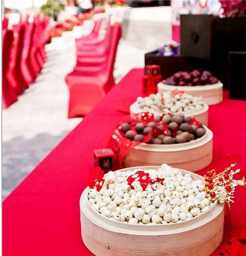 在结婚现场中,需要准备的食品有:软饮料、酸奶、红枣、喜糖、水果、开心果、莲子、红酒、茶叶、瓜子、啤酒、白酒、桂圆、花生等等。