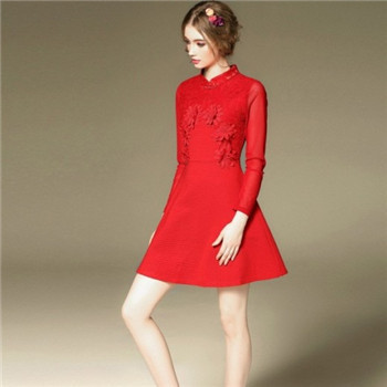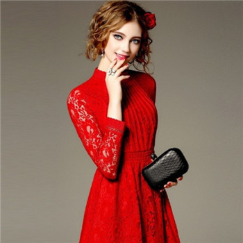 敬酒服是越红越好,当然红色是必定会考虑的色彩,蕾丝的面料也是性感的挑选,斯妲黛莎女装一款蕾丝连衣裙,到膝盖的长度这样作用也是棒棒哒,敬酒服不宜过分夸张,配上一款黑色手拿包气质就出来了。
