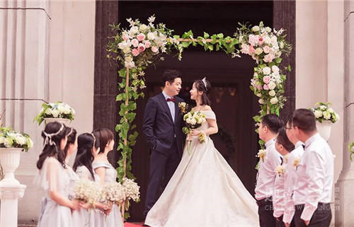 新娘:传统婚礼中,新郎新娘会佩戴胸花和标示着身份的绶带,但是在教堂婚礼中是不需要胸花和绶带装饰的。通常,新娘会在发髻和手腕处用花朵来装饰,鲜花的颜色应以素色为主,白色、香槟色都是不错的选择。较好不要选择红玫瑰,因为红玫瑰色彩过于浓烈,不适合庄重的教堂婚礼。