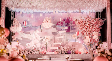 灵感源于云丛之城秘境灵物——独角兽,将其形如白马的纯洁,甜美可化万物倾注婚礼当中,用上万朵进口仿真粉嫩樱花搭建出云间梦幻城堡婚礼。蜜匠资深花艺师和设计师耗时四十多个小时手工穿制流光溢彩星光网,所有细节再三比对,潜心尽力精选糖果粉嫩系引领台风,配以1米8直径铁艺龙骨实体热气球,将婚礼甜美风造到极致。