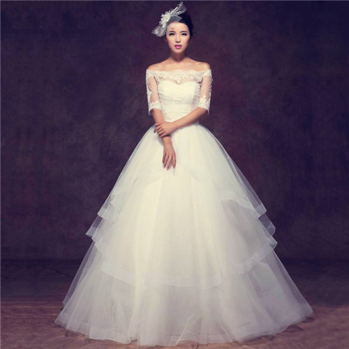 袖子设计要领:展示笔挺的肩部线条 拥有接近西方人的宽大骨架的高个子,应该选择能展示出肩部线条的袖子,做个时尚新娘。
