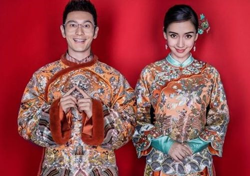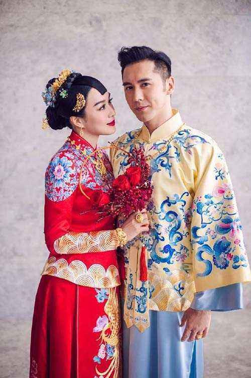 新娘穿秀禾服,那么新郎可以穿定制喜服、长袍马褂、改良唐装、中山装或者深色西服。黄晓明和baby的世纪婚礼上,迎亲敬茶环节baby的服装就是秀禾服,黄教主作为搭配选择了定制款中式喜服,同样的大红色与金色刺绣图案,十分喜庆。较传统较常见的还是长袍马褂。钟丽缇和张伦硕的迎亲礼服也是秀禾服 + 定制马褂,但张伦硕的长袍马褂是明黄色主色,加上和钟丽缇秀禾服同色的蓝色刺绣。而且两人的礼服上都有百花元素,象征生平富贵、爱情美满,福寿三多。如果觉得长袍马褂太夸张,可以选择中山装,或者中山装改良而成的上衣。和龙凤褂一样,中山装上较好有相近的暗花和刺绣,和新娘的裙褂“天生一对”。如果新郎不想囍袍换来换去,也可以直接穿深色西装。