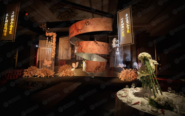 中式婚礼的主要布景应该在主舞台,婚礼主舞台该怎样设计呢?首先我们可以用刺绣的布,从天花板一直缠绕着放下来,刺绣上面还有用树枝的来搭配,下面的话,可以用金黄的稻穗来做铺垫,旁边则可以写一首诗,用黄色的花来修饰这首诗词。