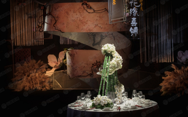 既然是中式婚礼,当天全场任何有关婚礼的都要是中式的,所以我们在用餐的桌上可以摆放用竹子搭成的创意装饰品,用百合花来装配在竹子身上一直往下放,真的非常古朴。