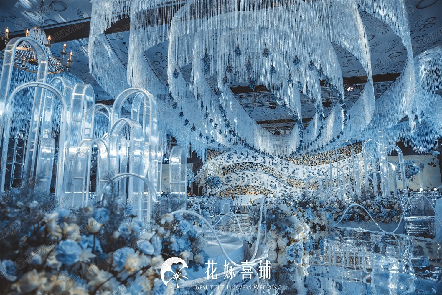 3.现场的灯光一般都是可以控制的,所以尽量用冷色调代替中式主题的暖色调。偏白色的冷色系灯光可以为整个现场营造浪漫的氛围。