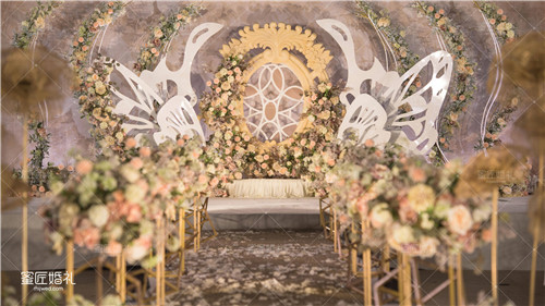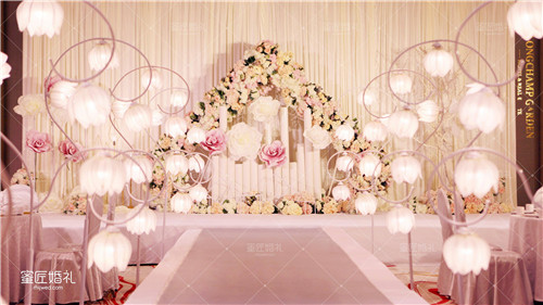 织暖是一场馥郁香槟色的婚礼,婚礼整体的颜色十分的浪漫,有档次,也有着小清新的风格,看上去比较的浪漫优雅。有种春天明媚的画面感,十分的有朝气,婚礼整体的花艺都是高低错落有致,而且用钻石灯可以打造出浪漫清新的感觉。高档的原木色系以及半圆形的花门设计,让婚礼现场清新灵动,用清新的铃兰花灯用作路引,更是仪式感十足,珠光地毯,清新灵动。