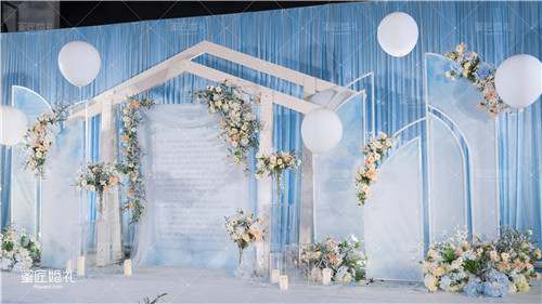 整场婚礼给人一种优雅清丽的感觉,十分清新,而且还用半透纱质画布打造家的感觉,哪些透明的水晶柱子梦幻唯美,白色的自然木质在用精致的花艺点缀,让婚礼现场更加的浪漫美好,独特的主舞台空间,呈现出慢慢的高级感以及层次感,让婚礼现场更加的与众不同,高低台面的花艺,精致绽放。