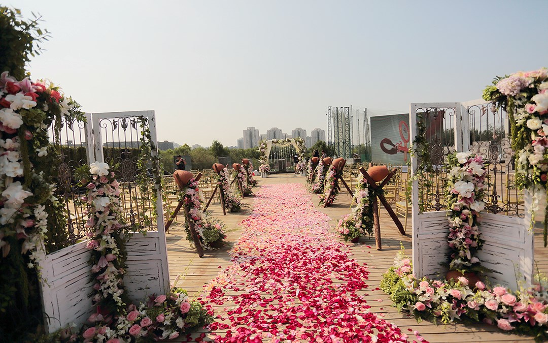 幸福亭在简单婚礼里面其实是可有可无的,不过如果要装饰的话可以就直接搭建一个方形的框架盖上白色然后扎上一些鲜花作为装饰就行了。