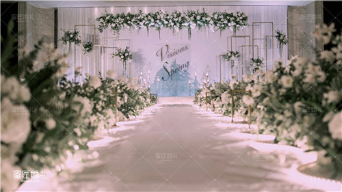 清漾林语这款小清新的主题婚礼十分的受欢迎,婚礼主舞台运用到了纯白色的布幔,然后周围还有大量的绿植花艺搭配,悬挂在金色的铁艺造型上面,打造出不一样的层次感,钻石灯让婚礼现场更加的闪耀,晶莹璀燦。还有特意高端定制的金色花器装饰,两边的清新绿色植物完全展现了清新生机勃勃的感觉。
