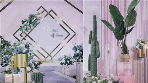 这款主题婚礼非常的文艺清新,主题婚礼颜色是莫兰迪高级色,非常的养眼耐看,还有大理石纹的背景墙,低调优雅,定制的黄铜几何架高端又有层次感,周围还有热带的绿色植物,搭配网格的点缀,让婚礼现场更加的高级了。仪式通道和主舞台的几何相互呼应,两旁高低错落的绿色植物非常的亮眼,还有地粉色的气球点缀在旁边,轻奢有质感。