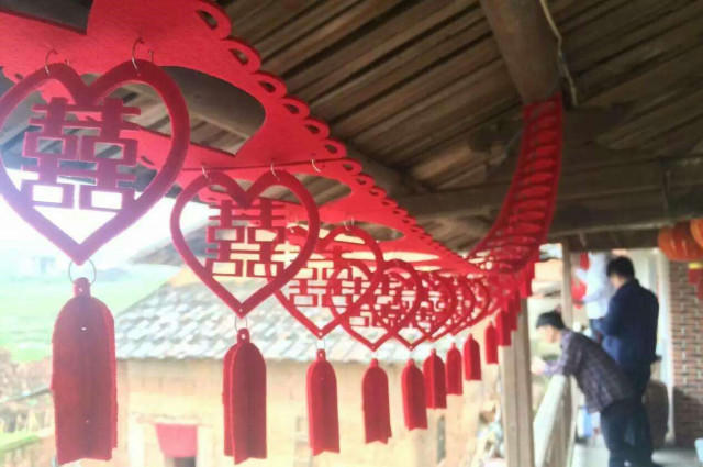 大多会在新人家大门口挂大红灯笼,门和窗都贴一些红双喜,家里的大厅里还会帖上喜联和特大的红双喜。
