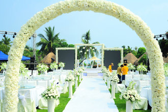 草坪婚礼举办的宗旨就是让人尽情放松,体味一场自由的婚礼,着装如果太过正式,反而会显得突兀。为了配合主题,这类婚礼的主流颜色自然应该是浅色系。当然着装要和婚礼举办的环境还有现场花艺颜色相衬。
