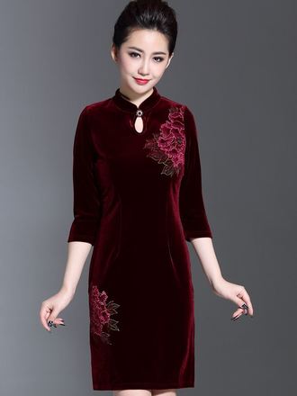 旗袍算是中年女士的较佳搭配,不过参加婚礼要避免穿着太过花哨的图案,应选择深色比如紫色,暗红色绣花图案。加上丝巾可是绝配哦!