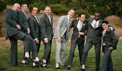 3、虽然伴郎西服的颜色和新郎的颜色相接近,但也还是有很多的颜色要忌讳的,比如:纯白色、绿色,因为有些新郎会选择身穿白色的礼服,所以伴娘也就不宜选择白色,而绿色一直以来都是婚礼较忌讳的用色。另外,伴郎在身穿深色礼服的时候,较好能够搭配黑色的袜子以及黑色的皮鞋,这样整体才相协调完美。