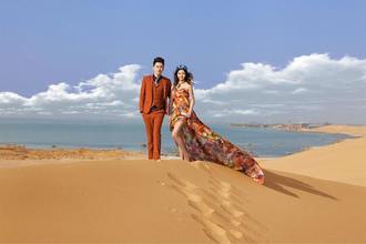 根据季节,沙漠呈现的颜色不同,沙漠中沙子的颜色并不是我们通常认为的就是黄色的,因为阳光的原因,沙子在阳光照射下,颜色会发生变化。夏季不适合在沙漠拍照,日照太强,而且得预防刮风。在沙漠中拍照一般可以选择春秋两个季节,阳光照射不是很强烈,新人也可以很快适应环境。如果是正午时刻,沙子泛着黄光,这时候不要穿黄色的婚纱和礼服,可以选择白色或其他色,新郎不要穿太深的衣服,以免因为阳光问题,加之角度问题,面部太暗淡。沙漠中拍摄根据早中晚,选择合适的婚纱和礼服。