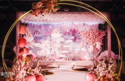 婚礼的主舞台采用40平米梦幻云顶,在梦幻中不失奢华大气。然后采用特制仿真3米樱花树让现场变得粉红而浪漫,而且朝向天梯的独角兽也是进入过无数少女的梦中。整个舞台采用粉红色为主色调,并以白色为主色调,让整个梦幻婚礼显得纯洁无瑕,舞台背景采用城堡来装饰,并且合理运用到天空之城的与热气球的色彩,让整个婚礼舞台背景都围绕梦幻婚礼这个主题来布置。舞台上采用粉红花艺让整个现场变得甜美无比。