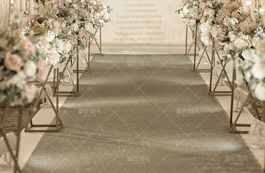 仪式通道则采用复古珠光地毯,让仪式通道显得大气而优雅,在定制铁艺架上布置花艺给予仪式通道一种高贵感,在仪式通道两旁布置好灯光,让新人走上仪式通道就可以享受万众瞩目的感觉。