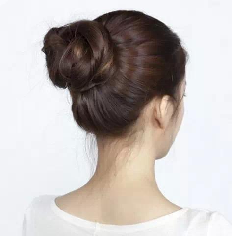 用橡皮筋将发束扎成高马尾,而脑后的头发则扭转用黑色小发夹固定在脑后。