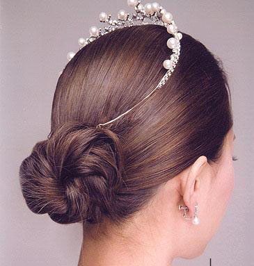 新娘首先要把头发吹直,使头发看起来更加垂顺,然后将头发拧成一缕,并盘在后脑勺中间的位置,然后牢牢地固定住,以免头发发生松散的情况,再佩戴上精致的头饰,凸显出新娘高贵优雅的气质。