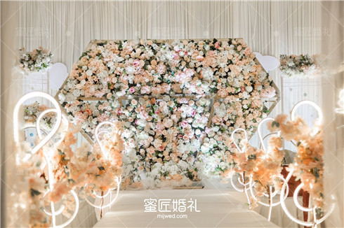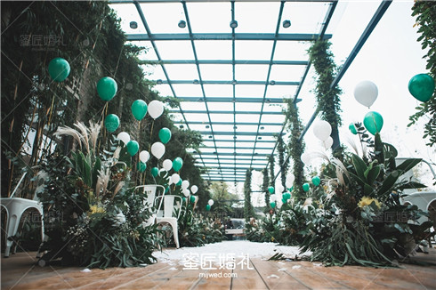 婚礼仪式区的不需要繁琐的大型装置!简约别致就好。简约不是少,而是没有多余。选择一两个有意义的元素,加些巧妙地点缀作为背景。干净纯粹,如你们的爱情。迎宾区是这场婚礼带给来宾的较好印象,所以,不仅要有风格上的统一,还有别出新裁的亮点。婚礼花艺的花器,尤其在迎宾区可以别出心裁,无论玻璃的、藤艺的,盆形的、球形的、柱状的,从庄重高雅的大型花艺,到清新野趣的花艺小品,配合不同的场地条件,都可以达到不同的视觉效果。