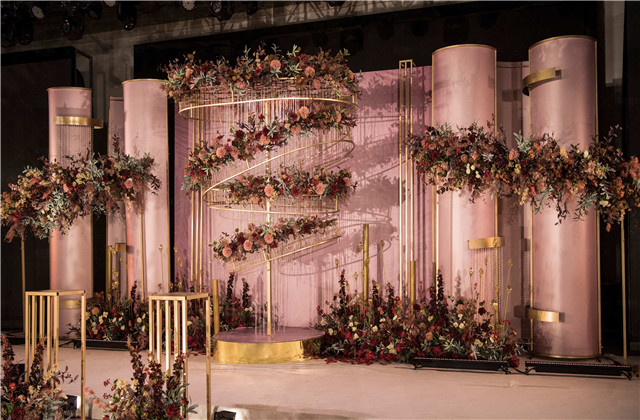绚丽闪耀的金红配色搭配错综繁复的几何图形,演绎极致的华美,成就我一生中较完美的时刻。华贵经典的金红配色搭配着铁艺缎带装饰,浓烈的泼墨色彩一层层晕染出远山云海的意境,金色圆环铁艺搭配仿真花装饰,轻复古带来华贵大气,红丝绒桌布点缀金流苏,复古花器与浪漫烛台演绎深情。