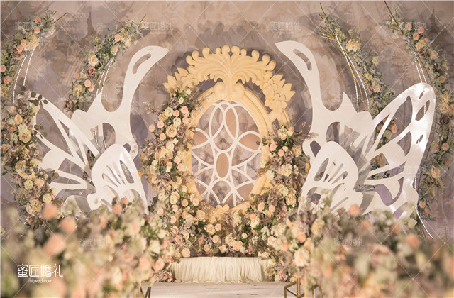 整场婚礼以浅香槟为基调,暖黄色的灯光,朦胧的水雾,烘托出温馨浪漫的唯美场景,干净的大型道具布搭配白色香槟色的花艺,让新人和来宾们都能陶醉在幸福梦幻的氛围中。发光S造型金色铁艺,缠绕白色发光灯带与精致花艺,灵动生气,欧式相框造型泡雕与香槟色渐染花朵更添神圣浪漫之感。
