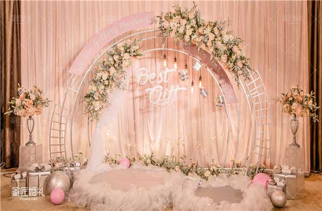 灵感源自于礼盒,我们一生会收到过许多个礼物,较好的礼物就是婚礼上我们彼此说着“我愿意”,而婚礼又像打开礼物盒的一个仪式,开启全新的另一段旅程!柔美的铁艺飘带蝴蝶结点缀在特制2.4米金属礼盒造型上,线谱花艺伴在礼物盒两侧,糖果色泡沫球依偎着水晶亚克力花柱,沁心的甜丝丝蔓延。