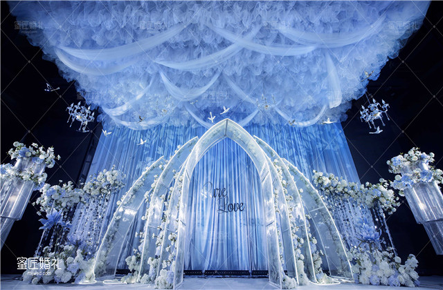 源于周杰伦与昆凌的盛世婚礼——Selby Abbey塞尔比教堂。用冰丝布幔打底,高价购入建筑类专业阳光板,使得教堂更为通透,辅以高仿真花艺与垂挂璀璨的珠片装饰,在洒满时光印记的教堂许下爱的箴言,神圣隆重,终身难忘。浅色冰丝布幔配以安文树枝点缀其间,独有的线条化与攀岩而上的淡蓝花藤相映衬,铁艺珠片和烂漫花海烛灯,飞鸟腾云而上,让自由爱意翩然入心。