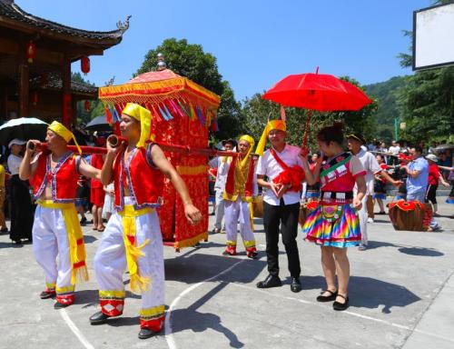 结婚这天,男女双方都在家里宴请亲朋好友和同村寨的乡亲。新郎由几个伴郎陪同,带着礼物前去娶亲。娶亲者中要有一位经验丰富的中老年男子,娶亲者到达女方村寨时,会有一引起妇女伸出竹竿拦住去路,要与娶亲者对歌。每对完一首歌,娶亲者都要拿出礼物给这些妇女,她们才会收回竹竿让路。如此走一段,对歌一次,反复数次才能到达新娘家。这期间,还要防止新郎让妇妇们抢走。如抢走了,她们会把新郎藏起来,让娶亲者不能按时娶到新娘。到了新娘家,姑娘们还会围住新郎,将他折腾、戏弄一番,引得宾客发出阵阵哄笑。 更有甚者,有的姑娘还用锅灰把新郎的脸抹得黑不溜秋的。望着新郎的狼狈样,人们会爆发出哄堂大笑。