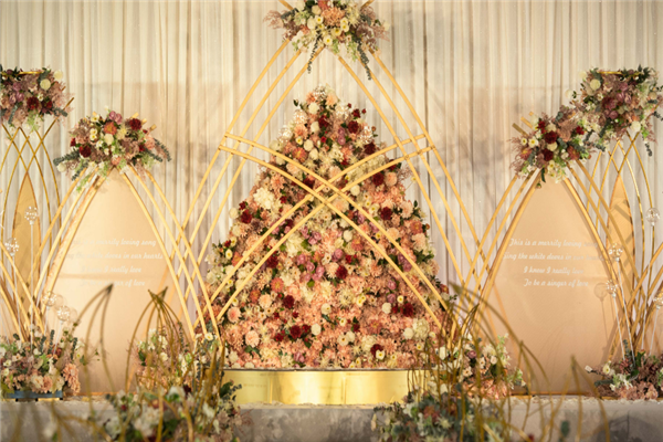 三个不同维度组合而成的立体交叉三角形,寓意完满且坚固的爱意,解构手法的全新演绎,皇冠与蝶翼围合出大气盛放的背景。和风旭日,青草花香,灵动的小情歌在耳畔响起,带来舒芙蕾般的甜蜜时光。偷偷想象你牵着我的手走向舞台,也走向更甜蜜美好的未来,灵感便是在此悄悄诞生。流光溢彩的流沙布幔在光影中摇曳闪烁出和煦的韵调,棱角分明的铁艺被烤漆工艺镀上了浅浅的低调奢华。