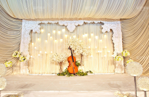舞台的装扮要特别注意,既不能太简单,凸显不来新人的风格,又不能过于花哨,抢新人的风头。比如:在布置时,可以在背景板上加入纱幔,再纱幔上家上新人的LOGO或挂一个happy wedding的LOGO牌,再配上鲜花进行点缀,则能增加舞台的亮点,营造出温馨、浪漫的婚礼氛围。