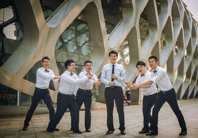 将气球放在新郎与伴郎及兄弟与兄弟胸口之间,然后用力挤压直到爆照。你看着表情反差多明显,你就知道这个项目有多欢乐。