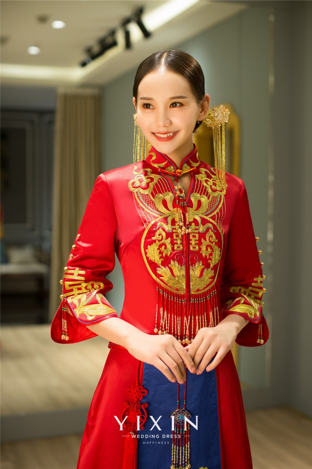 红色是我国传统嫁衣的颜色,红色象征着喜庆吉祥,而红色的婚纱也让人显得朝气蓬勃、活力欢乐。