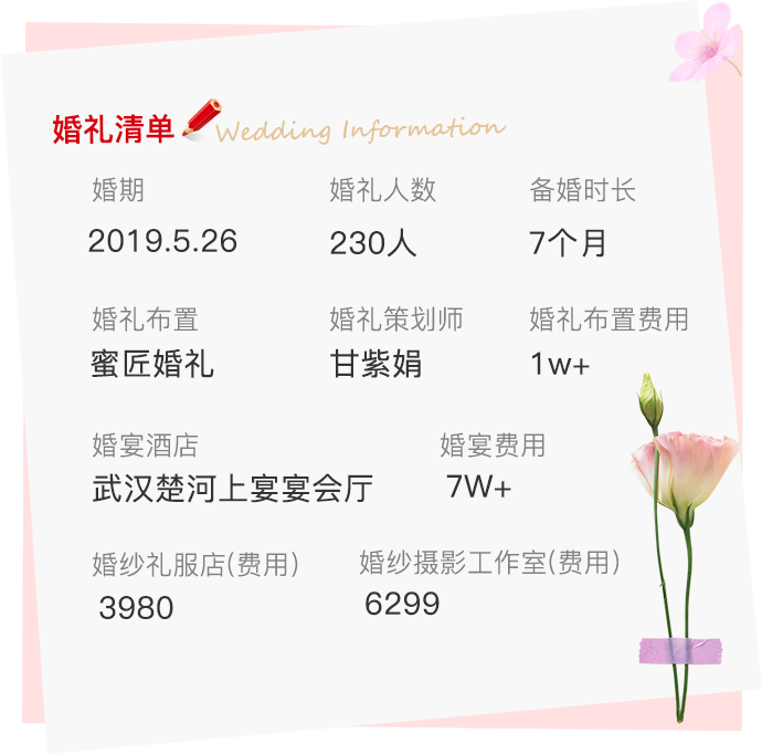 婚宴酒店定下来后,我才知道原来酒店的驻店婚庆也是蜜匠,没有任何犹豫就联系了策划师甘紫娟小姐姐到武汉店里了解,一拍即合,当下就定了蜜匠作为婚庆策划。