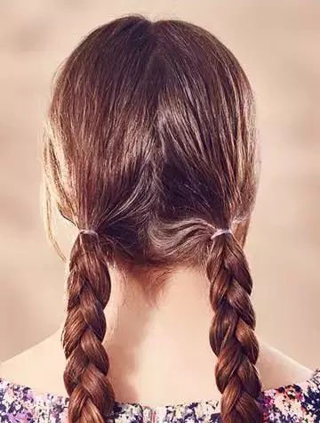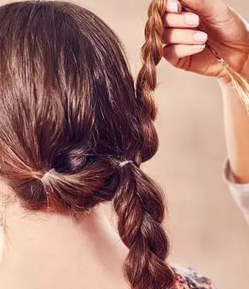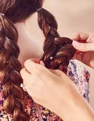 STEP 2:将马尾分别编成三股辫,编到发尾后用皮筋固定。