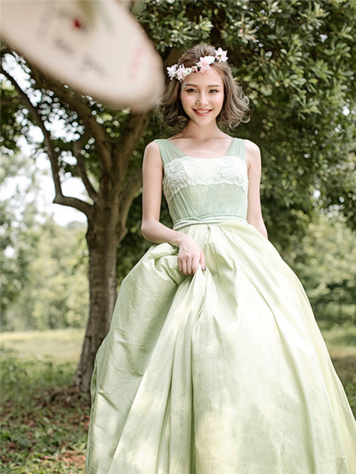 2、坐在地上,然后把裙子散铺在地面,拍摄时用较高角度,新娘头部则微微抬起。