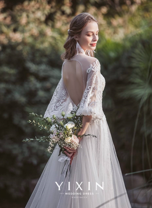 这款婚纱森系中带点文艺的复古,巧妙的鱼尾拖地版型彰显双腿完美的线条,