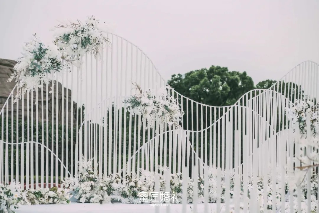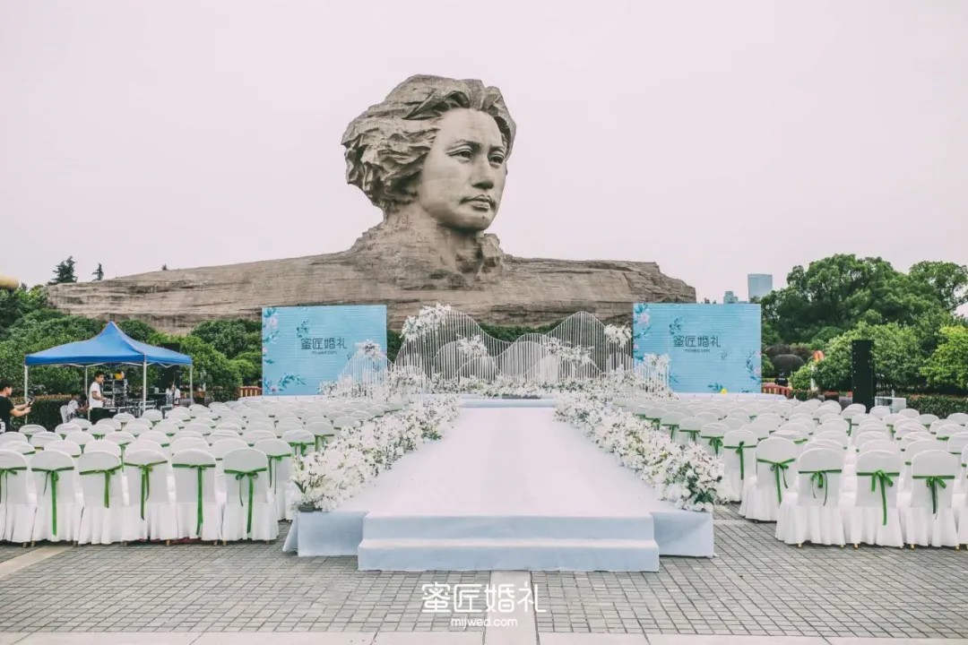 婚礼搭建在橘子洲头标志性景点处,纯洁的白色在这样的场景下显得格外清新自然,不规则的背景设计唯美时尚,总之就一个字“美”。