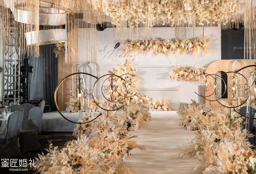 设计特点:半圆花艺拱门轻奢质感,花艺围绕气质高雅,多层背景结构丰富饱满。