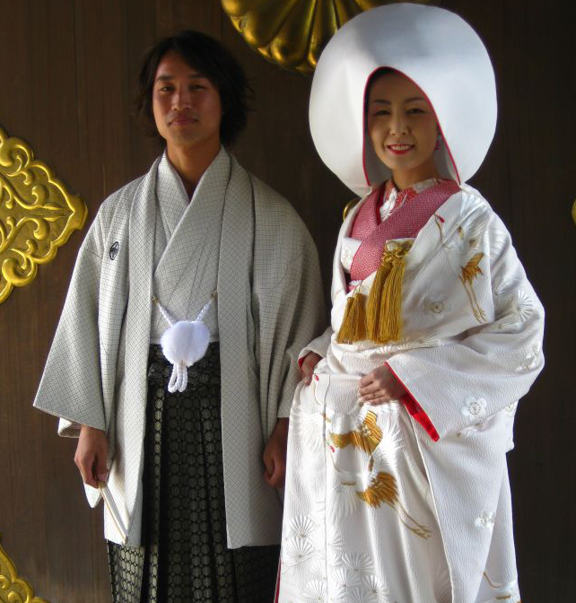1. 在日本,白色是新生活开始的象征,也意味着原有生活的结束。所以在结婚典礼中,新郎会穿上羽织衣物,新娘则穿“白无垢”礼服和戴白色锦帽子。正式的“白无垢”由三件全白衣服搭配而成,上面绣有白鹤或其他代表吉祥的图腾。