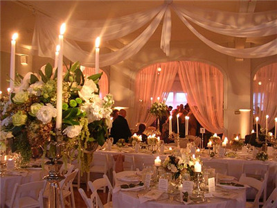 天花板是最容易忽视的地方,浪漫温馨的婚礼现场是不会将天花板裸露在外的,可以通过一些飘逸的丝带和纱幔点缀,烘托完美的婚礼现场。